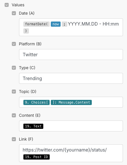 Hojas de cálculo de Google: Una vez publicado el tweet, necesitas actualizar tu lista de publicaciones añadiendo una nueva entrada. Es necesario hacer esto para que los próximos posts no repitan los ya publicados. Ya tenemos toda la información necesaria para ello. Así que todo lo que tienes que hacer es pegarla en los campos correctos.